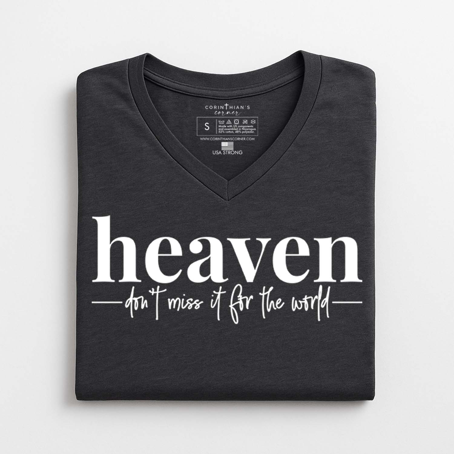 Heaven is real, and you can spread the blessing of eternal life with our beautiful v-neck tee. Our women’s inspirational t-shirt is a dark gray heather with contrasting white font, making the message bold and beautiful.